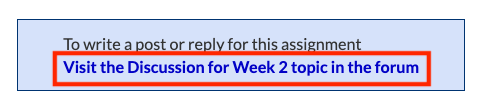 To add a post, click the link in the blue box that says, “To write a post or reply for this assignment Visit the Discussion…”