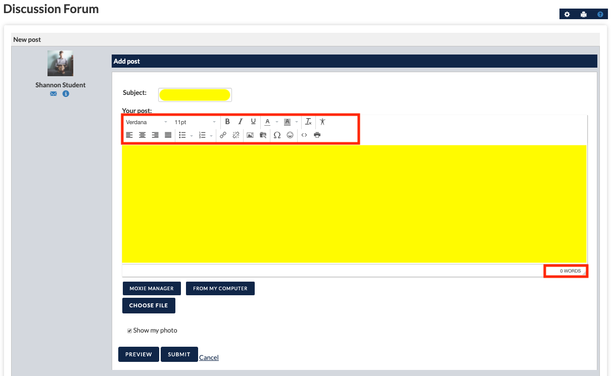 Você será solicitado a adicionar um assunto e inserir o seu texto na caixa. Você irá notar que há ferramentas de formatação para confirmar que sua postagem atenda os padrões aferidos pelo professor. Você também irá notar que há uma contagem de palavras nessa caixa.