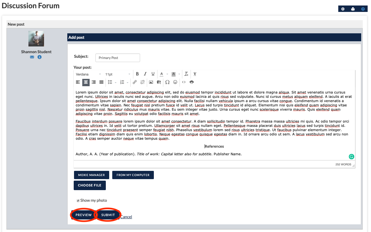 Se você estiver incluindo um arquivo para referência, por favor, se certifique de que você também incluir uma cópia do texto na própria caixa do fórum de discussão. Seu professor e os outros alunos não irão querer baixar um arquivo .doc para lerem suas postagens. Você irá receber uma resposta muito melhor dos seus colegas de turma e dos seus professores utilizando a caixa de texto fornecida para você. Quando estiver satisfeito com a aparência das suas postagens, você pode tanto visualizar uma prévia da postagem ou submetê-la utilizando os botões exatamente abaixo da caixa de texto.
