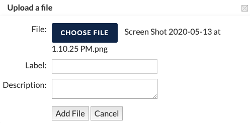 Na próxima página, (opcional) insira um rótulo [label] e/ou descrição [desciption] para o(s) arquivo(s). Caso contrário, clique em “Adicionar Arquivo” [Add File].