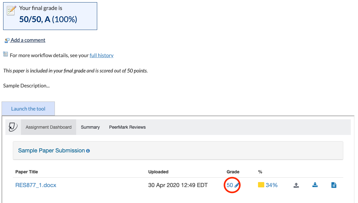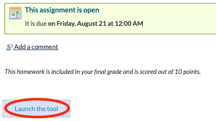 Quando a visão for expandida, você poderá selecionar uma atividade para ver seu trabalho. No caso de uma atividade do Turnitin, você poderá precisar “Lançar a ferramenta” [Launch the tool” na página subsequente para revisar os comentários e as notas deixadas pelo seu professor.