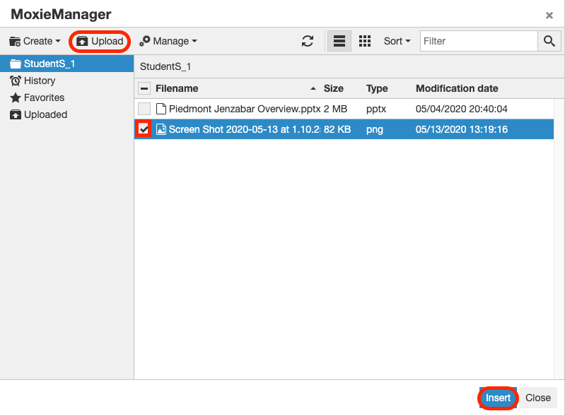 A próxima janela que vai aparecer será seu “Gerenciador Moxie” [Moxie Manager]. Pense nisso como sua pasta pessoal de arquivos dentro do eLearning. Você pode escolher fazer o upload de um arquivo ou selecionar um arquivo específico. OBSERVAÇÃO: quando o arquivo estiver carregado no seu Gerenciador Moxie [Moxie Manager], clique na caixa ao lado do(s) arquivo(s) que você deseja enviar para a atividade. Depois de satisfeito com a seleção do(s) seu(s) arquivo(s), clique em “Inserir” [Insert].
