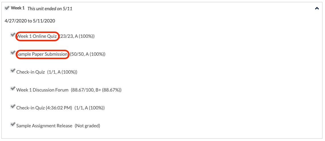 Quando uma unidade (nós normalmente as organizamos em termos de semanas) tiver se encerrado, você irá notar que o conteúdo dela estará em cinza e também estará comprimido quando você voltar à área de atividades. Para revisar o trabalho dessa unidade, clique no ícone em forma triangular à direita dessa unidade em específico para expandir a visualização.