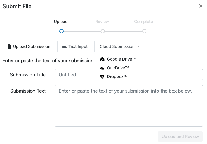 You may opt to upload a file from your local device, type your submission, or select a file from Google Drive, OneDrive, or Dropbox.