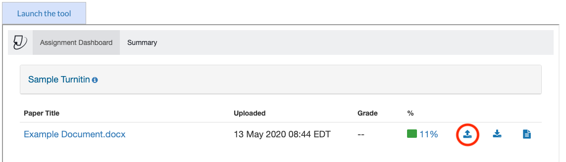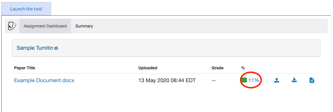 Se você desejar revisar uma entrega de atividade, siga o mesmo caminho para acessar a caixa do Turnitin e clique no valor da porcentagem listado ali. Você poderá revisar o relatório de semelhança [similarity report] e baixar o relatório em PDF, entre várias outras possiblidades. Mantenha em mente que o relatório pode levar algum tempo para ser gerado e, em alguns casos, o professor pode não permitir que você reveja a atividade até que o prazo limite chegue. Para checar essa informação, você pode tanto clicar no botão de atualizar do seu navegador ou pode clicar em “Lançar a ferramenta” [Launch the tool]. Você também pode voltar para a mesma área alguns minutos depois.