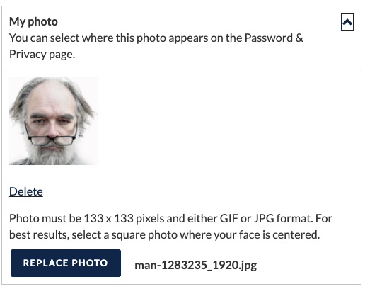 Se necessário, clique na seta para baixo no canto superior direito da caixa para Minha foto [My photo] para expandir a caixa.